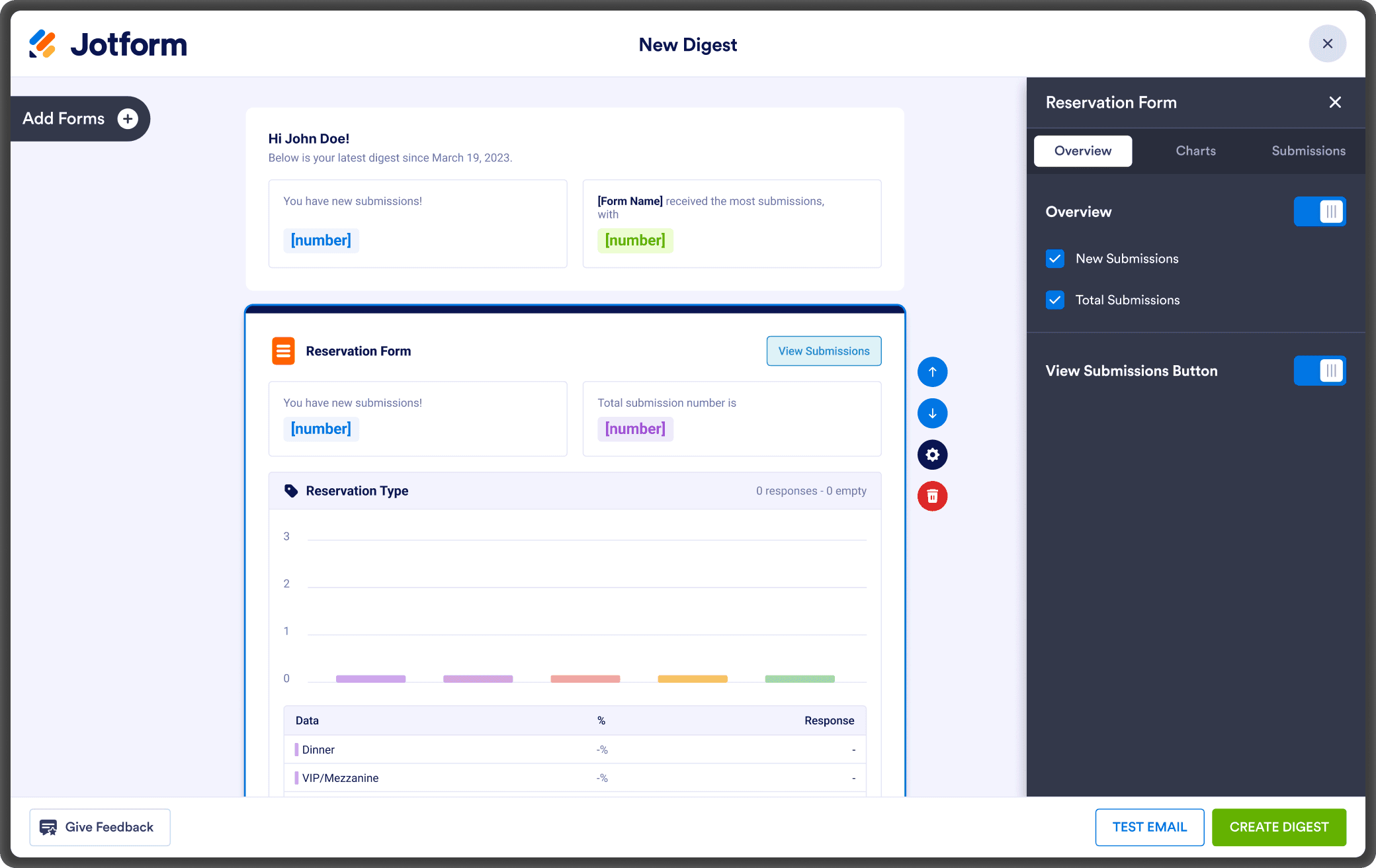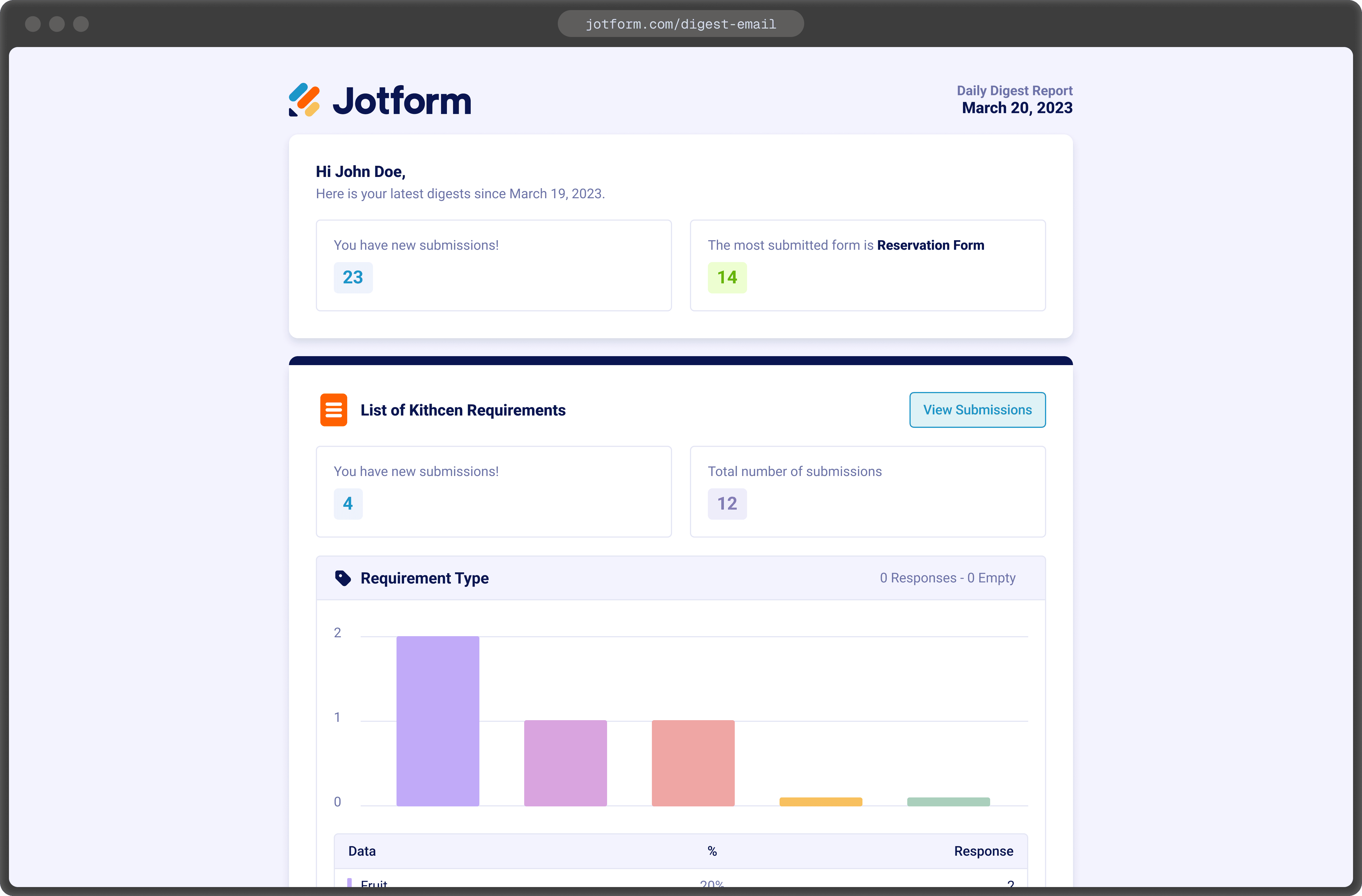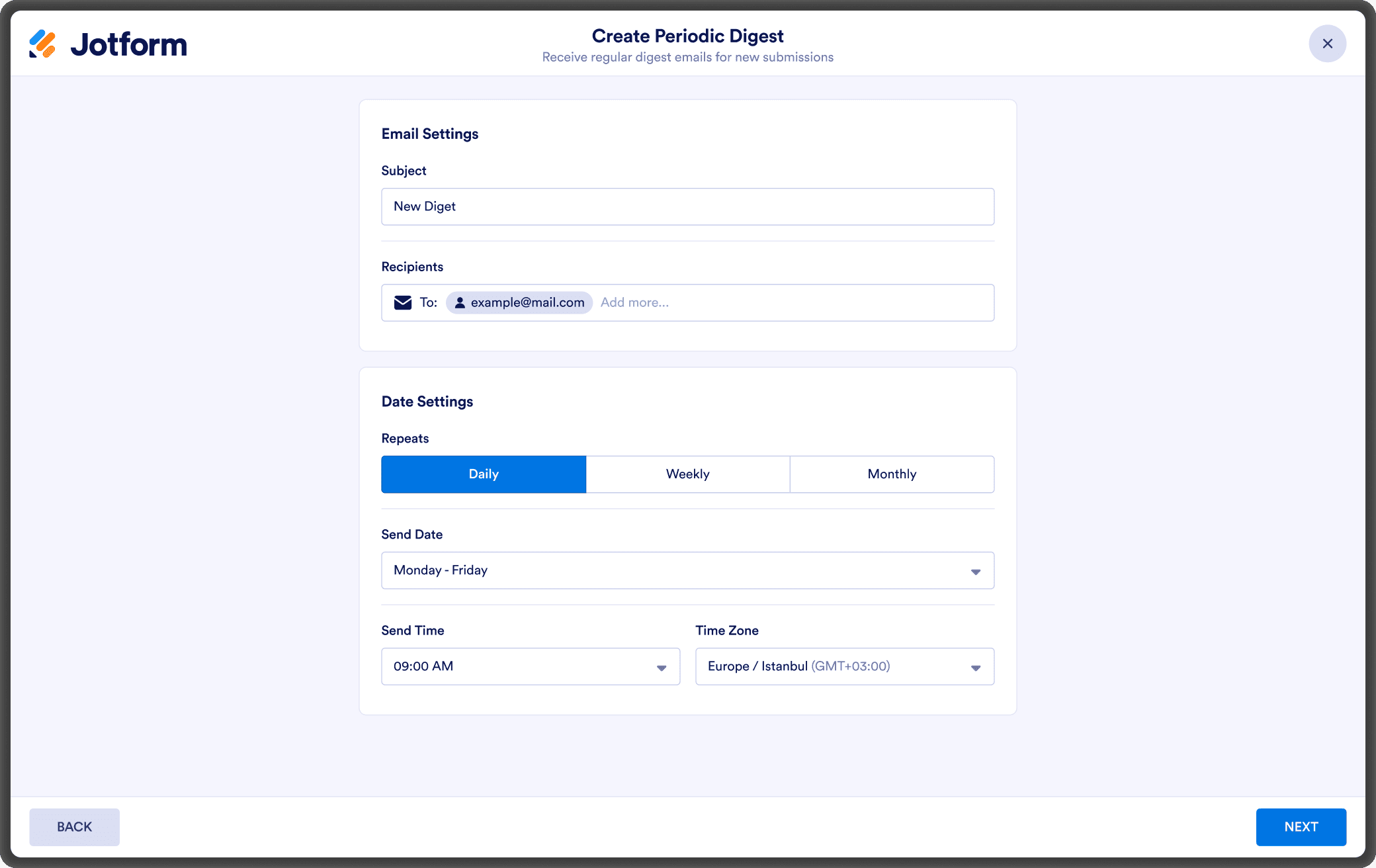 First introduced in 2018, Jotform Digest Emails allows users to receive a summary of their form submissions at chosen intervals—daily, weekly, or monthly. While form notifications provided real-time updates, frequent submissions often led to notification overload, making it difficult for users to track their data efficiently.